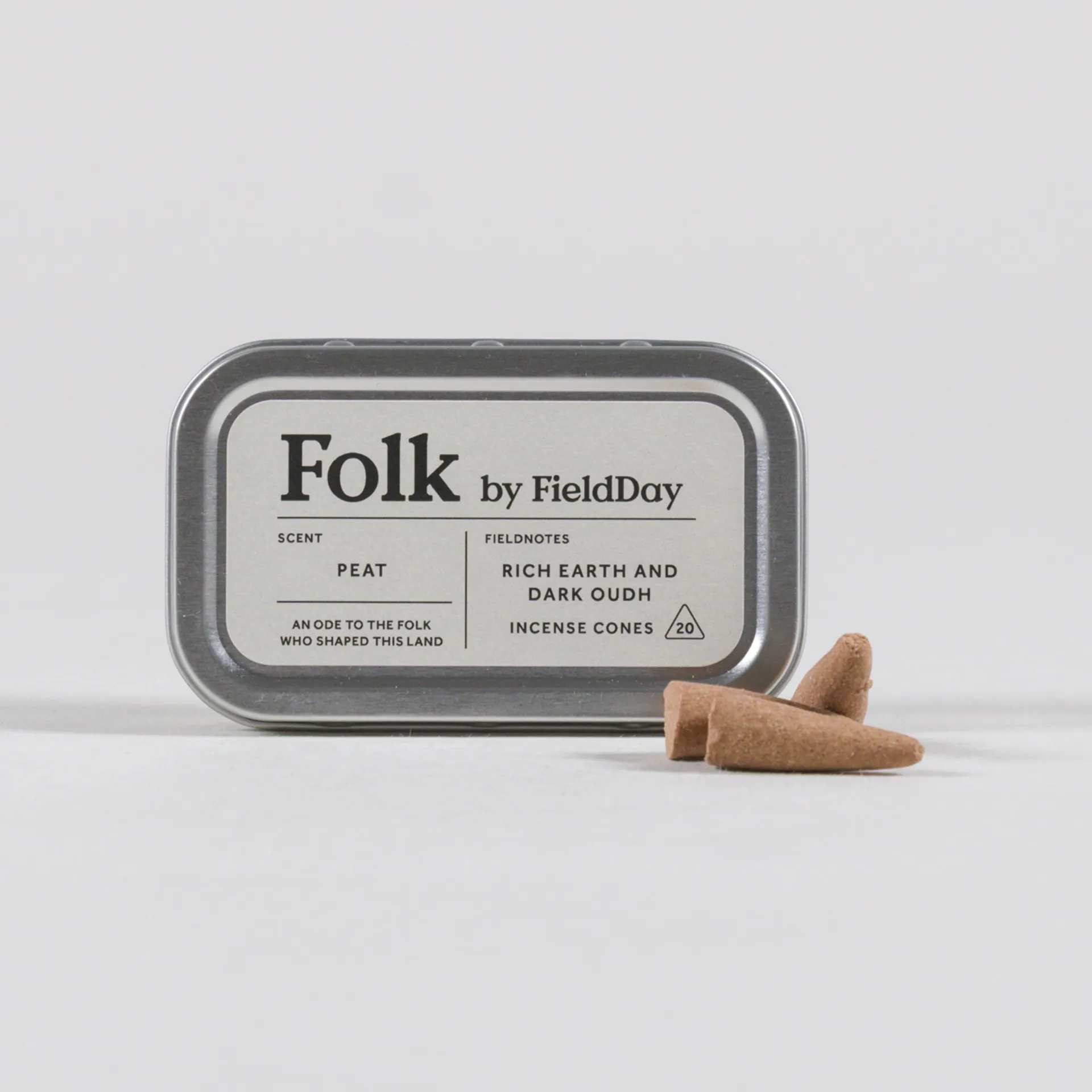 A tin of 20 incense cones from FieldDay, hand-dipped and air-dried in a blend of natural and essential oils. Cones are made from natural wood powders.