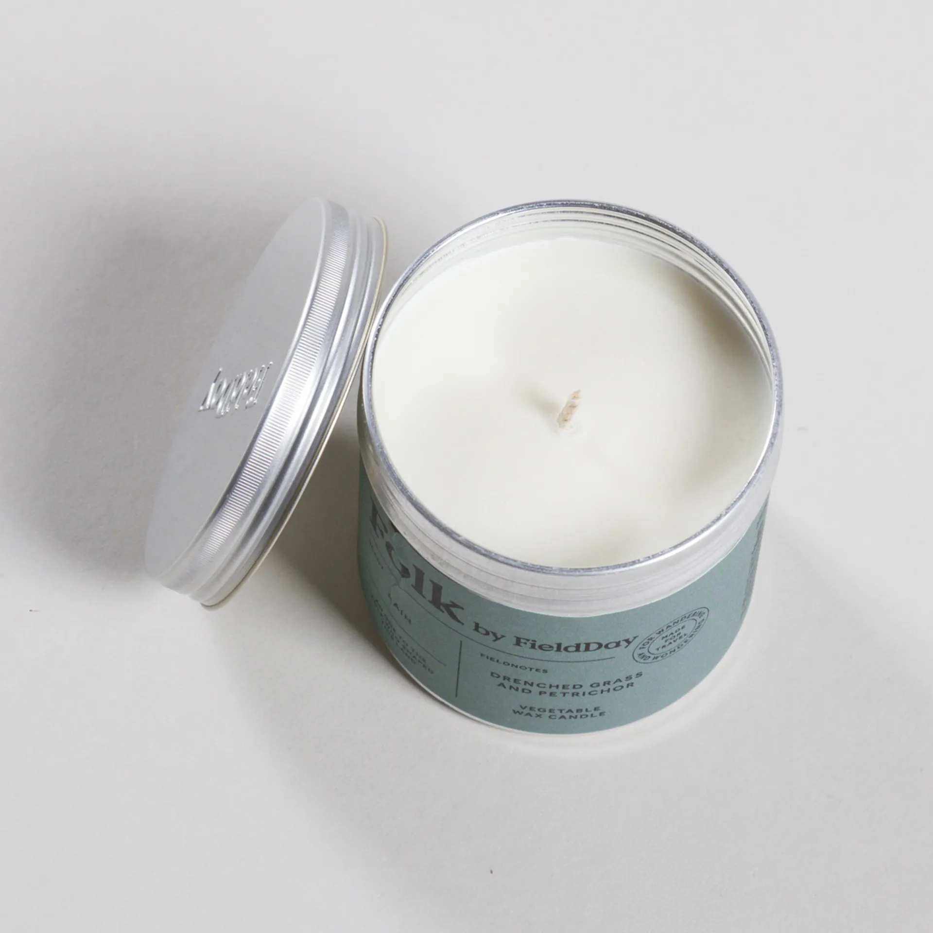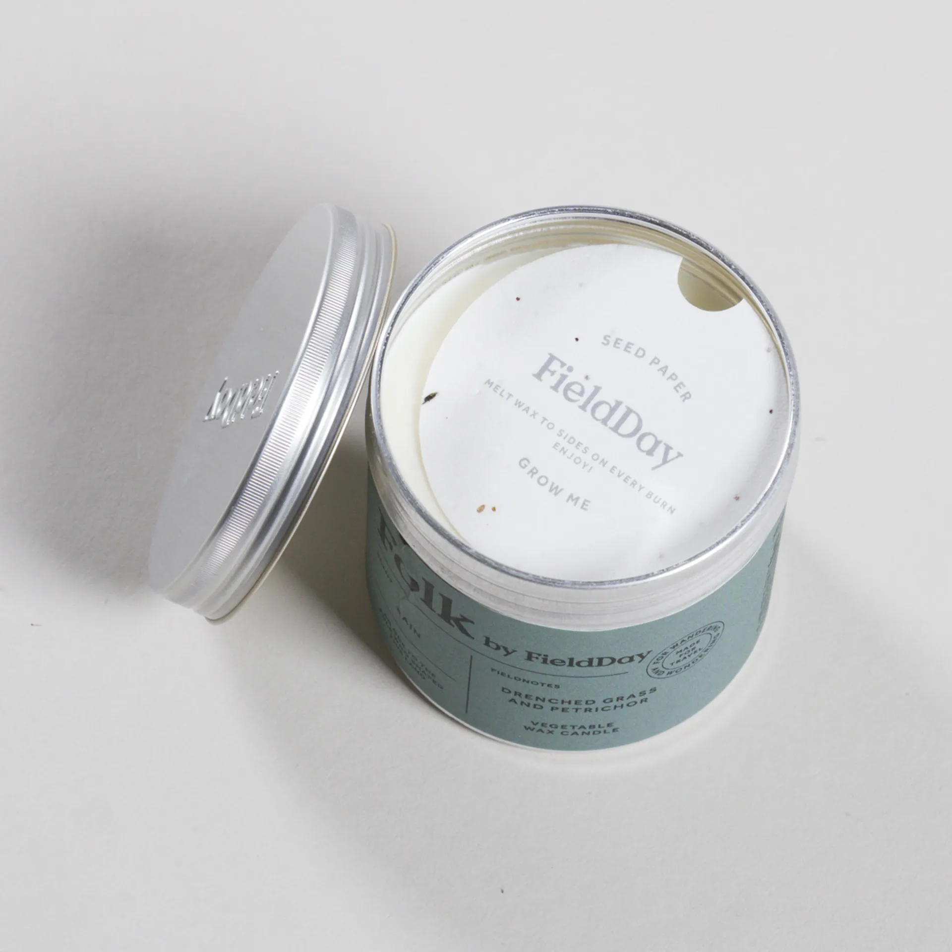 A hand-poured, vegetable soy wax candle from FieldDay, housed in a fully recyclable aluminium tin.