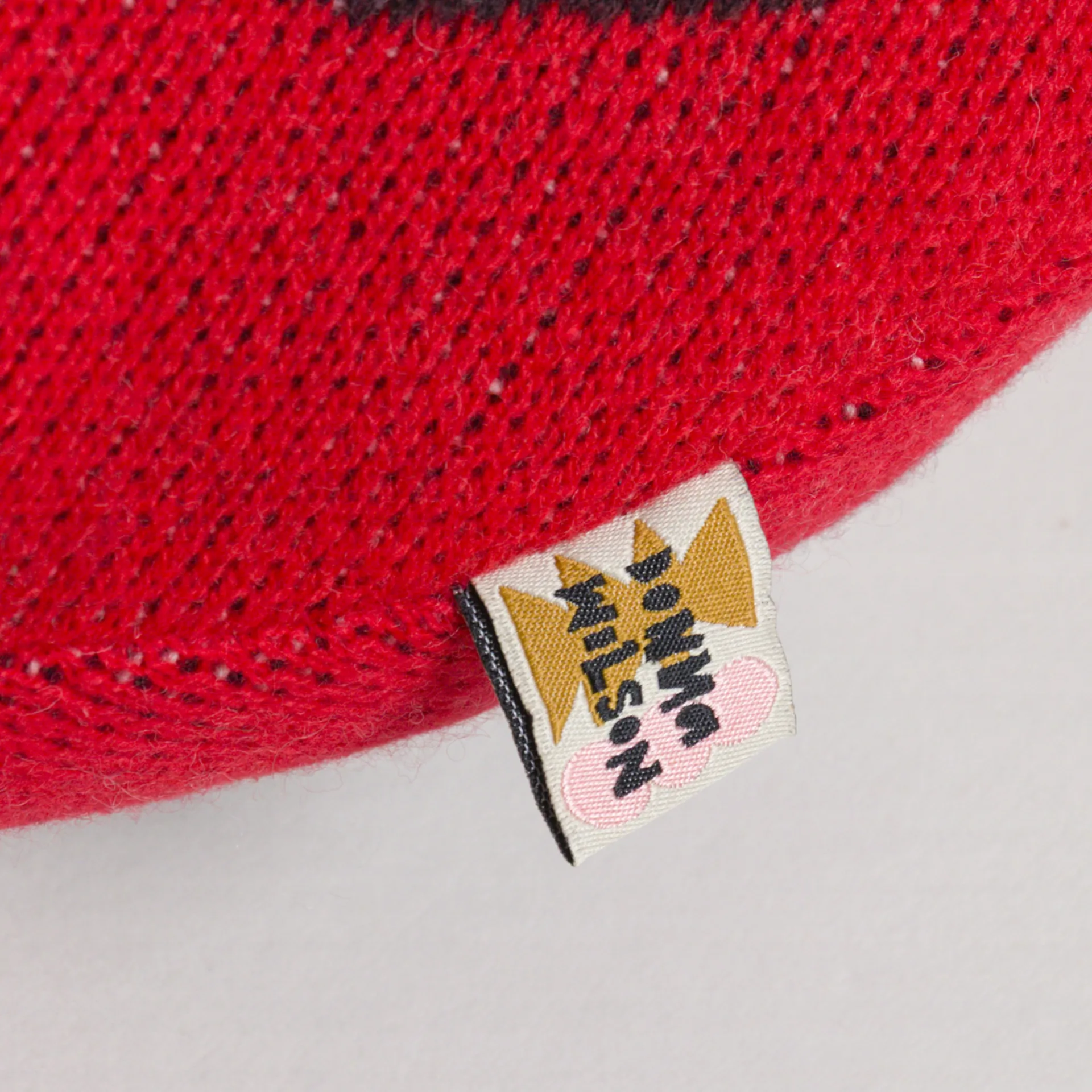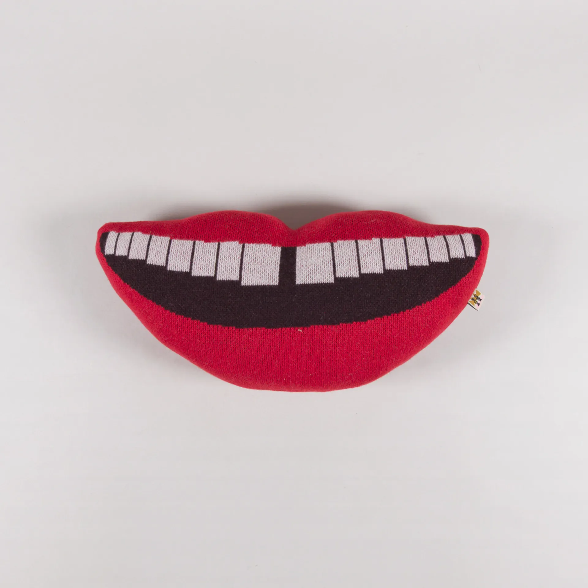 A smile-shaped cushion from Donna Wilson, crafted from 100% lambswool with a recycled polyester filling - knitted and hand-finished in Scotland.