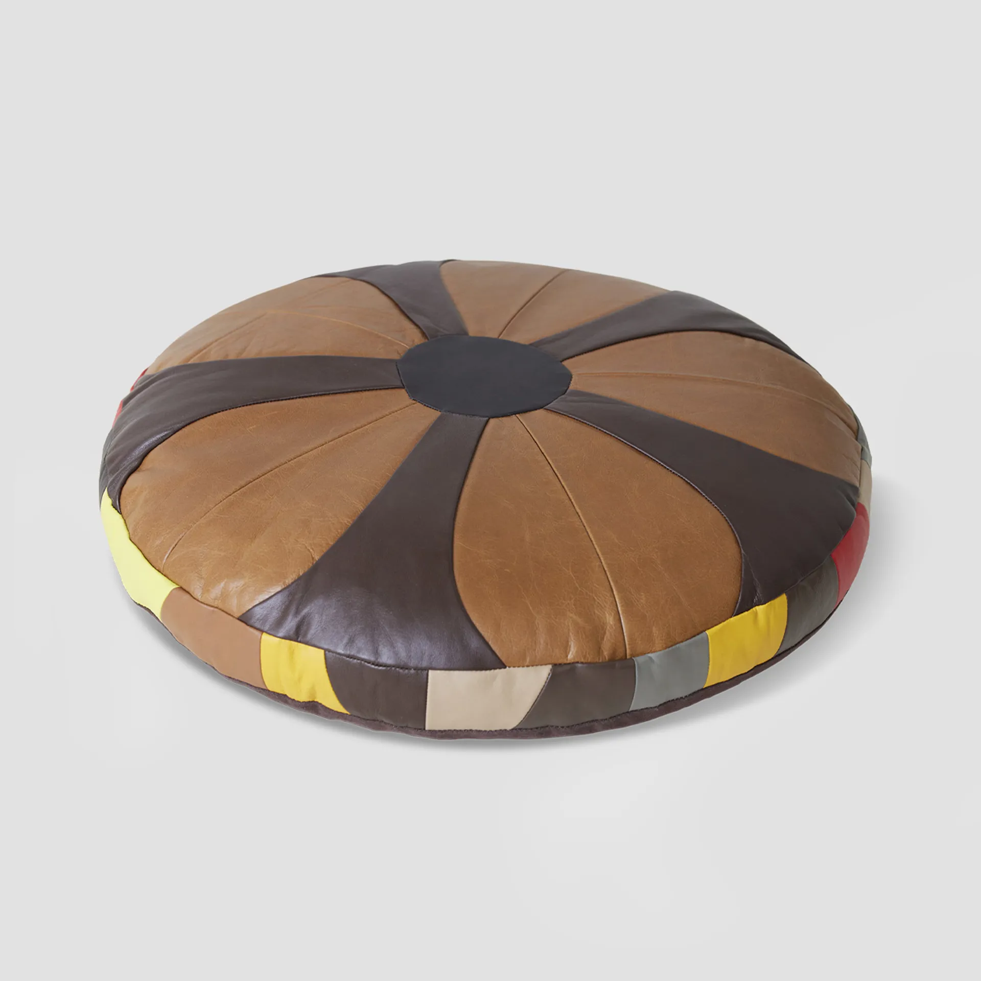 A retro-inspired cushion from HKLIVING, crafted from rich leather with a groovy patchwork design throughout, an invisible zipper and cotton filling.