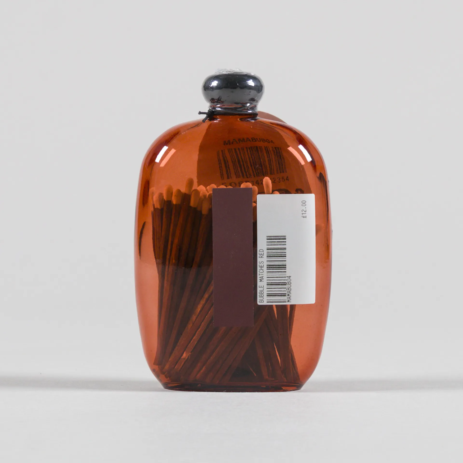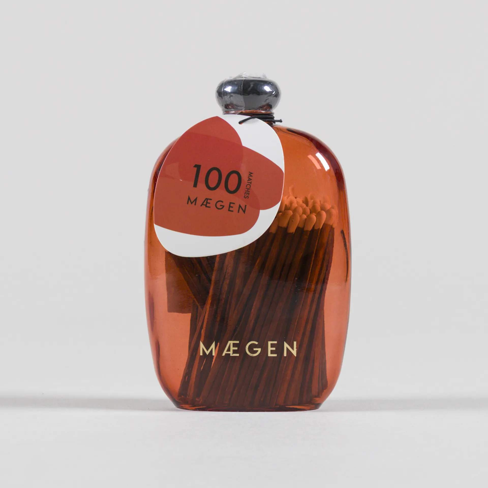 A colourful glass containing 100 matches, with striker paper on the back and a small black lid.