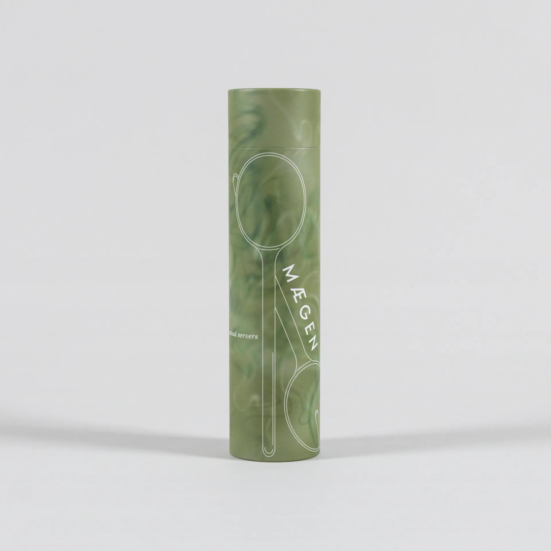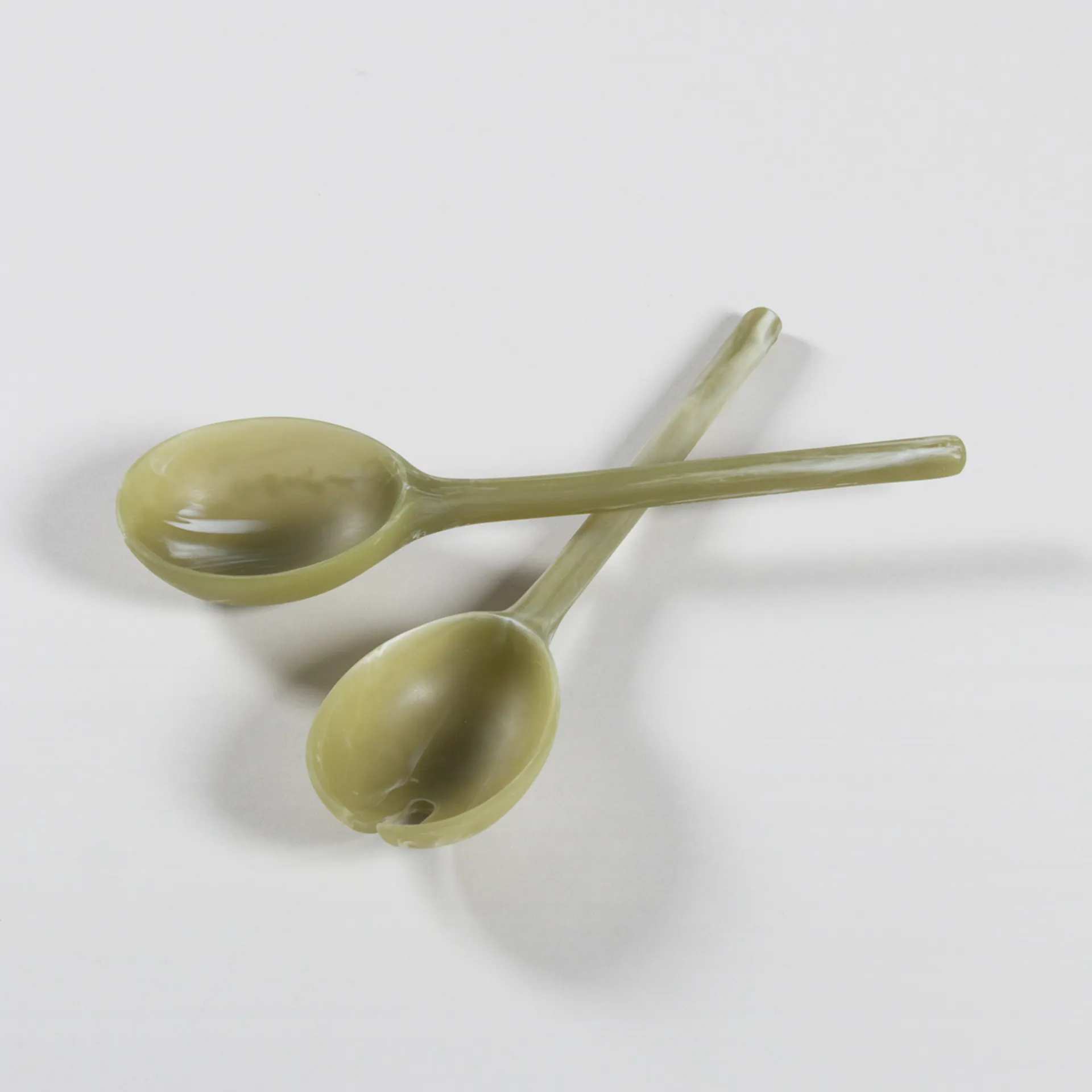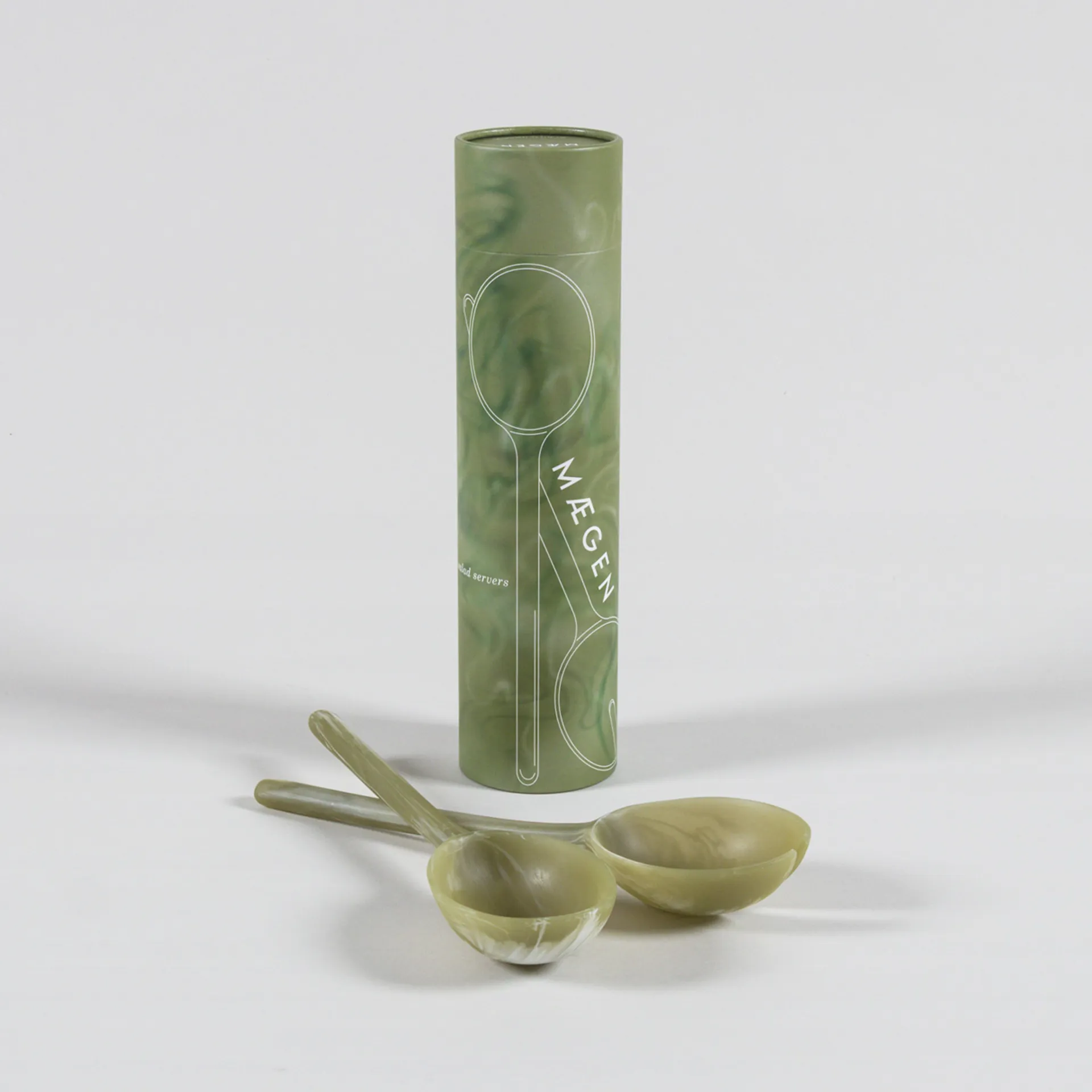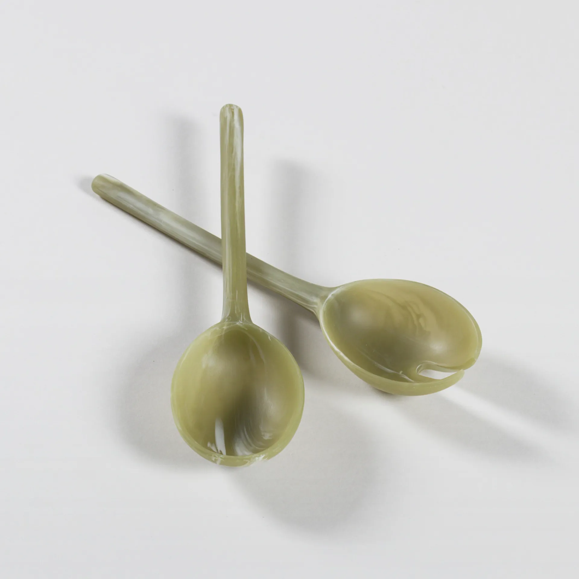 A pair of salad servers from Maegan, handmade from high-quality resin with an all-over marble design.