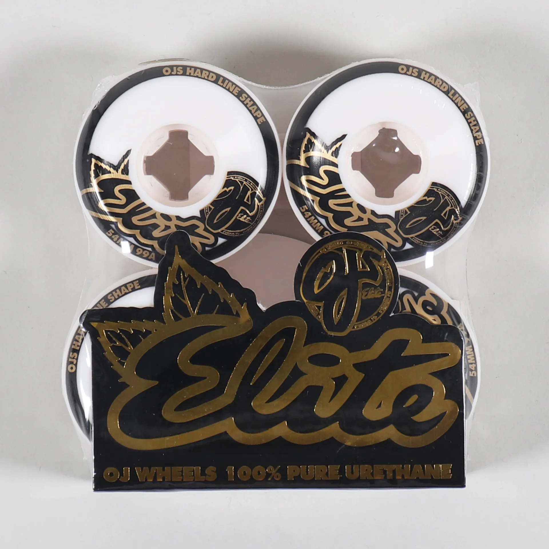 OJ Wheels Elites Hardline 99a White Wheels 54mm. Flatspot resistant urethane. Wide road surface and conical cut. Set of 4 Wheels.