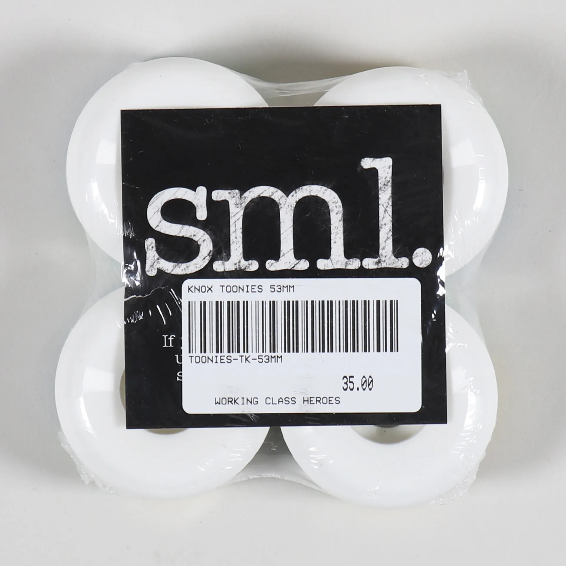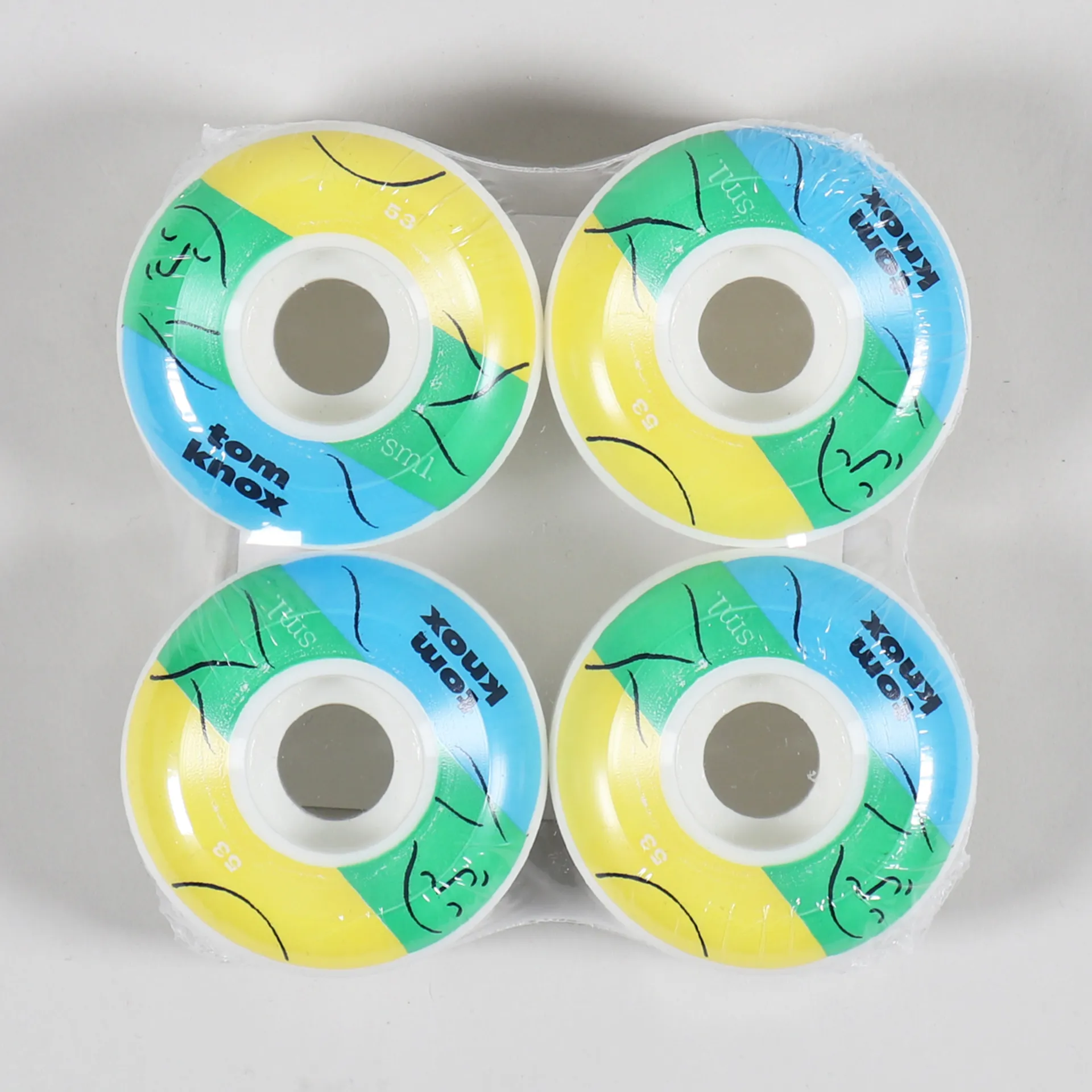 A set of skateboard wheels from SML Wheels for Tom Knox. OG Formula, V Cut, 99a, 53mm.